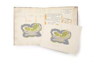 - La maquette de travail du texte imprimé avec essais typographiques, annotations et mesures typographiques, la justification étant manuscrite : elle comprend 8 gravures originales dont celle de couverture et une en double. Nombreux fragments de texte sur des papiers découpés avec traces de papier collant ; mention en tête au crayon rouge IIèmes épreuves du texte ;