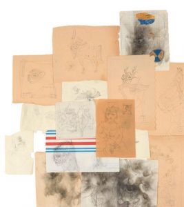 Cinq dessins, dont deux signés et datés de mars 1949, ont été exécutés sur des morceaux de nappe en papier : visage au crayon, forme abstraite, vache, oeil dans un cadre et, sur le cinquième, une femme nue pour laquelle Bellmer a utilisé les taches de liquide maculant la nappe.