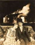 Il figure un couple assis sur un canapé ; derrière, une grange brûle.