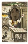 Carte postale en chromolithographie figurant une cartomancienne dont le visage, découpé en ovale, a été rempli par une figure en hologramme activée par une tirette ; message autographe signé “André” sur le verso d'une autre carte postale contrecollée.