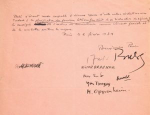 Max Ernst, Jacques Hérold, Georges Hugnet, Meret Oppenheim et Yves Tanguy contresignant la répudiation.