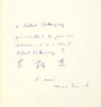 Envoi autographe signé orné de trois petits dessins originaux : a Robert Valançay qui mériterait la première dédicace, si ce n' était