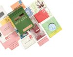 Boîte à lettres en cartonnage vert avec couvercle (18 x 28 x 6 cm), conçue par Mimi Parent, contenant un catalogue et divers objets.
