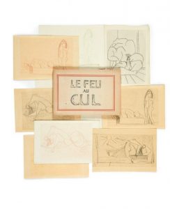 Georges HUGNET]. Le Feu au cul. Sans lieu ni date [Paris, Robert J. Godet, 1943]. In-16 oblong, cousu, couverture …