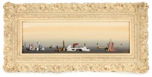 Elle est signée et datée de 1935 ; préservée dans un cadre en bois mouluré peint en blanc, lequel est contenu dans une boîte.
