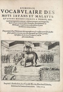 eux abordees. Plus les Monnoyes, Espices, Drogues, & Marchandises, & le pris [sic] d’icelles. — Neck (Jacob Corneliszoon van) et Wijbrant van Warwijck. Le Seconde [sic] livre, ou Journal comptoir, contenant le vray discours et narration historique, du voyage fait par les huit navires d’Amsterdam, au mois de l’an 1598. Amsterdam, Cornille Nicolas, 1609. Ensemble 2 ouvrages en 2 volumes in-folio, basane brune estampée à froid, filet ondulé autour des plats, large cadre central en basane plus claire délimité par deux roulettes, fleuron aux angles, dos à nerfs, pièce de titre verte, tranches dorées (Reliure pastiche moderne). Schlup, Grands livres de voyages maritimes de la Renaissance au XIX e siècle, pp. 49-57. — Ternaux-Compans, n°1018. — Tiele, pp. 128-130 et 141-142. PRÉCIEUSE RÉUNION DE DEUX RARES RÉCITS DÉCRIVANT LES TOUT PREMIERS VOYAGES DES HOLLANDAIS AUX INDES ORIENTALES Seconde édition de la traduction française, copiée sur la première de 1598, du Premier livre de l’histoire de la navigation aux Indes Orientales rédigé par Willem Lodewijcksz, l’un des commissaires de la flotte commandée par Cornelis Houtman et envoyée dans l’océan Indien de 1595 à 1597. Le but principal de l’expédition, organisée par la Compagnie amstellodamoise van Verre, était d’atteindre Banten, dans l’île de Java, et les îles Moluques pour y acheter des épices (poivre, clou de girofle et noix de muscade). Au cours de celle-ci, Houtman gagna l’extrémité occidentale de Java et parvint à signer un traité d’achat de poivre à prix fixe avec le sultan de Banten. Le récit renferme des détails minutieux sur le déroulement du voyage, extraits du journal de bord, et des informations très importantes sur les contrées visitées et sur le commerce des épices. Il contient surtout LA PREMIÈRE DESCRIPTION DE BALI FAITE PAR UN EUROPÉEN. L’ouvrage de Lodewijcksz joua un rôle décisif dans l’explosion du commerce des Hollandais et leur établissement dans les Indes orientales, brisant ainsi de manière définitive le monopole des Portugais sur les épices. Seconde édition de la traduction française, après la première de 1601, du Seconde livre, ou Journal comptoir, qui est la relation complète de la seconde expédition commerciale menée par Jacob Corneliszoon van Neck et Wijbrant van Warwijck aux Indes orientales (1598-1600). Elle renferme très certainement le PREMIER VOCABULAIRE IMPRIMÉ SUR LES LANGUES MALAISE ET JAVANAISE ; en pagination séparée avec une page de titre particulière, et disposé sur trois colonnes, celui-ci s’intitule Appendice, vocabulaire des mots javans et malayts, qu’avons mesmes escrits a Ternati, servant de promptuaire a ceux qui y desirent naviguer, car la langue Malayte s’use par toutes les Indes Orientales, principalement ez Molucques. Très belle et spectaculaire illustration gravée en taille-douce comprenant une carte gravée sur le titre et 48 grandes figures dans le texte pour le premier volume, ainsi qu’une vignette répétée sur les titres et 23 grandes figures dans le texte pour le second. Outre des cartes montrant la topographie de ces contrées éloignées, on y aperçoit des plantes, des animaux, des indigènes costumés, des scènes de vie quotidienne, etc. Ces gravures seront quelques années plus tard copiées par Théodore de Bry pour illustrer sa collection des Petits voyages. Quelques bois gravés dans le texte (profils de côte, plantes, etc.) complètent l’illustration. Ex-libris manuscrit du XVIII e siècle d’un oratoire sur le titre du premier volume. Petite mouillure claire et papier arraché à l’angle inférieur de quelques feuillets du tome I, sans manque.