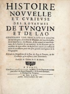 Marini (Giovanni Filippo de). Histoire nouvelle et curieuse des royaumes de Tunquin et de Lao… Paris, Gervais Clouzier, 1666. In-4, veau granité, dos orné, pièce de titre rouge, tranches marbrées (Reliure de l'époque).