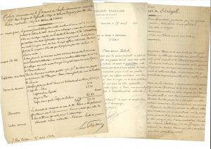 On joint un dossier familial d’une trentaine de doc. concernant notamment sa scolarité, son père Joseph Fabert (1796-1868), son oncle Jacques Fabert (1802-?) : carrières militaires, Légion d’honneur, Garde nationale, carte d’électeur….Important ensemble d’archives sur ses voyages et missions au Sénégal et en Afrique. Manuscrit de travail, sur L’accroissement de la Guyane par le partage du “Contesté”, avec carte dessinée des territoires contestés entre la France et le Brésil (1888). Note sur les Maures du Sénégal (1890). Note sur la mission Fabert faisant valoir l’expérience du chef de mission, qui est musulman, « a des relations personnelles déjà éprouvées dans le groupe des marabouts de l’ouest », [1891]… Rapport sur une escarmouche au Sénégal (1891). Minute de lettre en tant que chef de la Mission topographique et commerciale de l’Adrar (Sahara Occidental), au fabricant de pastilles de quinquina et tablettes de viande expérimentées au cours de la mission (1891). Projet de traité entre la France et l’Adrar proposé par Fabert et accepté par le roi Sidi Ahmed, et pièces annexes (1891). Note de Fabert sur un gisement de soufre dans la région du Tafoualli (1892). Conférence prononcée à Roubaix sur le Sénégal (1892). Statuts de la Société française du Pays des Braknas (Afrique occidentale), plan des concessions données à Fabert, compte rendu d’assemblée générale (1892). Convention verbale provisoire faite à Touizikt (Inchiri) entre Fabert et le chekh Hassan (1894), et minute du rapport au ministre à ce sujet (1894). Manuscrits et fragments sur la Guyane, le Sénégal, le Soudan français, etc. Liste de dessins destinés à illustrer son Voyage au pays du sable. Traduction de documents en arabe. Correspondance d’ingénieurs et constructeurs de machines, producteurs de plantes médicinales, transporteurs etc. Correspondance relative à L’Afrique française dirigée par Fabert. Registre de copies carbones de lettres de Fabert. Lettres de Léon Fabert (dont copies carbone). Lettres reçues de Théophile Delcassé, ministre des Colonies ; Émile Jamais, sous-secrétaire d’État des Colonies ; Henri de Lamothe, gouverneur du Sénégal ; le capitaine Eugène Aubert, directeur des Affaires politiques du Sénégal ; Charles Gilbrin, trésorier-payeur de la colonie du Sénégal ; le lieutenant-colonel Spitzer, commandant supérieur des troupes à Saint-Louis ; Léon Plarr, directeur de La France à Moscou (Exposition de 1891) ; Henri Mager, ami de l’Association de la Presse coloniale ; etc. Documentation manuscrite ou imprimée adressée à Fabert sur la Légion, des gites d’or dans le Transvaal, Madagascar, des incidents survenus à Saint-Louis entre la troupe et la population, etc. Accord entre sa mère, sa sœur et lui-même reconnaissant les avances sur la succession maternelle (1884). Télégrammes. Faire-part de décès ; obsèques et succession ; condoléances et lettres à sa veuve de René de Puert (Société de Secours aux militaires coloniaux), Jules de Guerne (6, Société des Amis des explorateurs français), l’Agence Havas, etc.