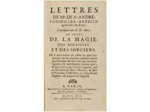 attribue ordinairement aux Démons ; & fait voir que ces Intelligences n’y ont souvent aucune part. A Paris: chez Charles Osmont, 1725. 2 obras en 1 vol. en 8° menor. 4 h. + 446 p. Vinetas, capitales y cul-de-lampe. [Sigue:] BOISSIER: RECUEIL DE LETTRES AU SUJET DES MALEFICES ET DU SOTILEGE. Idem, 1731. XII + 2 h. + 387 p. Enc. de època en plena piel. Nervios, tejuelo y lomo cuajado. Saint-André denuncia la credulidad popular sobre los maleficios y las brujas y demuestra con ejemplos que todo lo que se atribuye a las brujas y hechiceros es fruto de la imaginación.