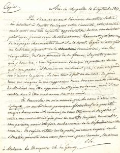 Aix-la-Chapelle 6 septembre 1852, à la marquise Charles de Ganay. Il résume le « tableau piquant de la soumission, de la résignation » de la France, selon Rémusat, cousin de la marquise, et se plaint que celle-ci l’ait mal défendu « d’être un sphynx, un ambitieux parce que Frohsdorf n’a pas été compris dans mon itinéraire »… Aussi rappelle-t-il ses positions depuis 1848 : « sobre de paroles » en tant que commandant de la division de Paris et la Garde nationale, « le Christ » à l’Assemblée législative dont la plupart de ses membres l’ont abandonné et trahi, et qui n’a pas écouté ses conseils… Il cite parmi ses opposants Berryer, Salvandy, Falloux, blâme « la funeste campagne de la révision » de la Constitution et des fautes qui ont perdu l’Assemblée et l’ont conduit en exil. Depuis, il a été sollicité par le duc d’Aumale, la duchesse d’Orléans et le comte de Chambord, et il a dit aux deux partis : « En présence d’un ignoble et insolent despotisme les républicains, s’il y en a d’assez bonne foi pour reconnaître que leur utopie est odieux à la France, et les Royalistes de toutes les nuances devaient se rallier pour montrer à notre pays l’espérance d’un gouvernement régulier, libre, et fort que la monarchie représentée par le Cte de Chambord entouré et secondé par ses cousins peut seule lui donner »… Face à « L.B. », les deux branches devraient déjà être réconciliées… Il souligne l’importance d’un accord formel et retrace les tractations difficiles et les erreurs de Chambord… Malines 4 janvier 1853, au comte Paul de Périgord. « Je n’ai refusé mes conseils ni à Froshdorf, ni à Claremont mais on se lasse de tout, même de parler à des sourds »… Cependant il estime que le comte de Chambord lui-même méconnaît le caractère inaliénable de la légitimité, et que même ceux qui ont fait la révolution de 1830 devraient tâcher de gagner des partisans sans leur faire subir un interrogatoire sur leur catéchisme politique… Que le comte de Chambord ait refusé d’ouvrir sa porte aux Orléanistes « avant qu’ils eussent récité leur confiteor » est une faute lamentable... Il justifie le titre de Reine de Marie-Amélie… Bruxelles 24 octobre 1858, à Philippe-Bernard de Laguiche. Texte d’une réponse à faire à ses critiques : « En refusant de faire, à la France moderne, la concession du drapeau qu’elle préfère parce qu’il n’est pas celui de l’ancien régime ; en se montrant offensé quand on donne, à sa tante, le titre de Reine, Mr le comte de Chambord a licencié les hommes qui ont souhaité la réconciliation, la coalition des royalistes de toutes les nuances, sans en excepter les républicains désabusés. Il demeure exclusivement le chef du pur légitimisme, et le général Changarnier ne veut pas faire acte d’adhésion à ce parti. […] Les princes de la maison d’Orléans ont été ses compagnons de guerre ; connaissant très bien l’indépendance de ses opinions, ils sont bienveillants pour lui ; il les aime. Pourquoi donc se refuserait-il la satisfaction de les voir ? »…