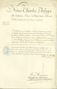 CHARLES X (1757-1836) Roi de France. P.S. « Charles Philippe », Versailles 11 juin 1786 ; contresignée par Esmangart de Bournonville, secrétaire des commandements ; 1 page grand in-fol. en partie impr., sceau sous papier..Certificat comme...
