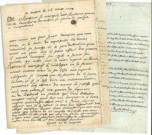 chef provisoire des royalistes du Poitou, Lyon 1799), Georges-René Pléville-Le Peley (à Saliceti, 1798), Hortense Perregaux duchesse de Raguse (1811), Mme de Riquetti-Mirabeau (1800), Sieur de Roquemartine (à son père seigneur de La Chaux, racontant la mort et les funérailles d’Henri II de Guise, 1664), duc de Schomberg (à M. Bressy à Pernes), Marc-Antoine Martinengo comte de Villeclaire (gouverneur et lieutenant général pour le Pape en Avignon, 1573). Lettres de gagerie et emprisonnement au nom de Claude-Louis Fortuné, tailleur (Carpentras 1688), et un manuscrit broché, Exposition des faits et des trâmes qui ont préparé l’usurpation de la Couronne d’Espagne, et des moyens dont l’Empereur des Français s’est servi pour la réaliser, par S.E. M. de Cevallos, premier secrétaire d’État et des dépêches de Ferdinand VII, traduit de l’espagnol (1809).