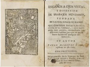 1733. (MAGIA). MINGUET Y YROL, PABLO: ENGANOS A OJOS VISTAS Y DIVERSION DE TRABAJOS MUNDANOS FUNDADA EN LICITOS JUEGOS DE MANOS. Madrid: Imp. Pedro Joseph Alonso de Padilla, 1733. 8° menor. Grabado a modo de frontis + 8 h. + 110 p. Ilustr. con...