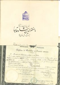 DIVERS. 34 pièces, la plupart signées, XIXe-début XXe siècle..Brevet d’officier en arabe (sceau du bey de Tunis)… Diplômes sur vélin de bachelier ès lettres, bachelier de l’enseignement secondaire classique, bachelier ès sciences...