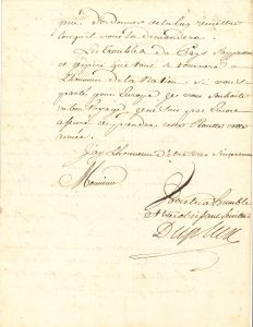les circonstances nous ont permis de la former. Ce sera le seul qui vous parviendra d’icy cette année, la Compagnie ne nous en faisant passer que le nombre dont nous pourrons nous débarasser. […] Les troubles du pays s’appaissent et j’espere que tout se tournera a l’honneur de la Nation. Si vous partés pour Europe je vous souhaite un bon voyage, je ne suis pas encore assuré de prendre cette routte cette année »…
