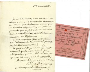 de l’Humanité au nom de Dupont de Nemours, « membre honoraire et bienfaiteur » (1808) ; et 6 L.A.S. de sa veuve (Françoise Robin, Mme Pierre Poivre, puis Dupont de Nemours).« Je vous remercie mon cher ami et collègue, et ne puis comprendre comment vous croyez que le Bureau, averti par un membre tel que vous, […] croirait devoir tenir une décision manifestement contraire au règlement. Le Bureau peut-il être autre chose que l’exécuteur du Règlement ? […] Et qu’y a-t-il pour un pouvoir exécutif quelconque rien de plus obligatoire qu’une loi, surtout qu’une loi en matière de propriété »…