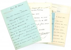 prospectus pour la Bibliothèque Populaire de Versailles (1866)..22 lettres, 1882-1908, à Édouard DETAILLE. À propos d’une décoration briguée par Detaille, sur Gérald Laffitte, invitations, remerciements, recommandation pour une amie anglaise peintre, tableaux de Detaille sur des sujets militaires ; Galliffet s’inquiète de la réduction du service militaire, donne des nouvelles des manœuvres de cavalerie, parle de Puvis de Chavannes, etc. (On joint 12 l.a.s. de sa femme, la marquise de Galliffet, à Detaille).