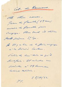 (19 ans) arrive de Grenoble pour s’engager. Plus tard il désire préparer St Cyr. Il y a lieu de le faire envoyer à la division Leclerc. Prière de lui dire ce qu’il faut faire. Il viendra se présenter à 17 h au Cabinet militaire ». Avec une Fiche de renseignements dactyl. sur Jean de Gaulle, demeurant « chez le Général de Gaulle, 4 rue du Champ d’entraînement, Paris ». On apprend qu’il a obtenu son bachot, qu’il fait du sport, a des notions d’allemand, et a été scout…