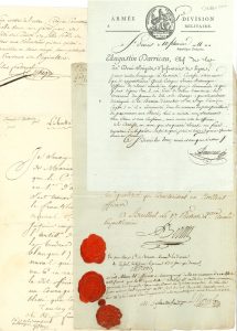 enrôlés suspects, 1793), Augustin Darricau (certificat pour un officier de santé qui a soigné les blessés dans les moments les plus périlleux à Aboukir et Acre, 1803), Balthazar Emond d’Esclevin (certificat pour un lieutenant en 1er d’artillerie de marine qui s’est comporté avec un courage remarquable à Aboukir, 1799), Jean-Victor Moreau (certificat de service, signée aussi par Nicolas Bertin, 1794), Jean-Charles Pichegru (relative à un arrêté du Comité de Salut public), Charles-François marquis de Sombreuil (à d’Angenoust, 4 juillet 1789, suivie d’une l. de celui-ci relative au déplacement, par précaution, d’armes aux Invalides).