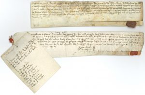 GUERRE DE CENT ANS. 2 chartes manuscrites, 1355-1376 ; vélins oblongs in-8 : 6 x 25,5 cm, et 5,5 x 30 cm liassé avec un autre de 11,5 x 9 cm, fragments de sceau de cire rouge aux armes..Angoulême 24 octobre 1355. Arnauld Tresson reçoit la somme...