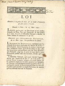 GUILLOTINE. Imprimé : Loi relative à la peine de mort, & au mode d’exécution qui sera suivi à l’avenir, Paris 25 mars 1792 (Imprimerie Royale, 1792) ; in-4 de 4 pages, bandeau..Loi adoptant un nouveau mode de décollation, avec « avis...