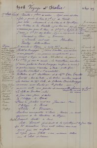 voyage d’après lesquelles a été rédigé le grand cahier..Journal et notes d’un voyage en Italie, fait du 17 août au 2 octobre 1908, et rédigé du 14 septembre 1915 à novembre 1916, depuis Le Vésinet, en région parisienne : étapes à Dijon, Lyon, Marseille, Cannes, Nice, Vintimille, Gênes, Pise, Florence, Rome, Naples, Pompéi, Bologne, Padoue, Venise, Vérone, Milan, Turin… Précisions historiques et nombreux détails sur les sites et monuments, les musées, les églises, les moyens de transport, les hôtels, le temps, quelques rencontres de personnes ; à partir de Vintimille, l’auteur est accompagné par Julia (probablement sa fille). Le récit s’interrompt brusquement : le soir du 2 octobre 1908, alors qu’ils étaient montés au salon de l’hôtel Bonne Femme et Métropole de Turin pour écrire, le voyageur reçoit « une foudroyante nouvelle »…