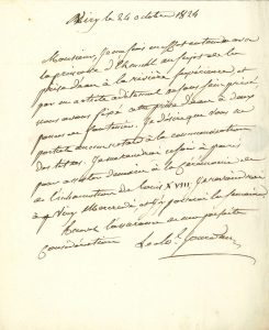 d’Eckmühl, qui le loua à Jourdan. 16 août 1824. « J’ai vu Madame la Princesse d’Ekmuhl ; nous sommes d’accord sur tous les articles. Il est nécessaire que vous soyez ici demain à huit heures du matin avec le projet d’acte que vous avez rédigé, afin d’y faire les changemens nécessaires, et de le mettre en état d’être signé dans la journée […], sans quoi on ne pourait plus obtenir, avant les vacances, le jugement dont on a besoin »… 24 octobre 1824. Il s’est entendu avec la princesse au sujet de la prise d’eau à la rivière supérieure, « et par un article aditionnel au sous sein privé, nous avons fixé cette prise d’eau à deux pouces de fontenier. Je désire que vous ne portiez aucun retard à la communication des titres. Je me rendrai ce soir à Paris pour assister demain à la cérémonie de l’inhumation de Louis XVIII »… 28 janvier 1825. Il se propose d’aller à Viry le 31 pour déménager ses meubles. « S’il ne vous est pas possible d’y passer pour me remettre les titres du domaine de Pied de Fer, je vous prie de les laisser au porteur de mon hôtel à Paris »…