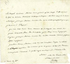 Madame de vous prévenir qu’elle accepte l’offre que vous lui faites des mémoires manuscrits du marquis de Dangeau. Elle désire que je les lui envoie à Boulogne. Je vous prie Madame de vouloir bien me les adresser promptement pour que je les envoie à l’Empereur. J’ai reçu aussi l’ordre de vous annoncer que Sa Majesté vous accorde une pension de six mille francs sur sa cassette »…