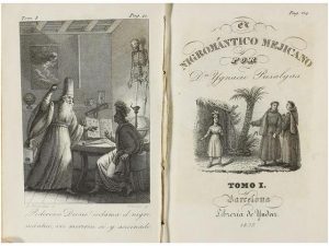 1838. (MAGIA). PUSALGAS, IGNACIO: EL NIGROMANTICO MEJICANO. Barcelona: Libr. de Yudor, 1838. 2 vols. en 12°. I: 253 p.; II: 258 p. Frontis grabados. Enc. en plena piel, tejuelo, lomo con doraros, cortes pintados.