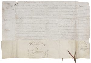 LOUIS XIV. P.S. (secrétaire), Versailles septembre 1709 ; contresignée sur le repli par Phelypeaux ; vélin in-plano, lacs de soie rouge et vert sans le sceau.