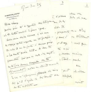 d’instruction à Belfort, 12 juin 1922, évoquant ses racines régionales..[Rabat] 17 mars 1925. Il se réjouit de la prochaine visite de son neveu, et propose un itinéraire d’Oran à Rabat, se plaignant des racontars provoqués par le vieux général de Lamothe, venu dernièrement au Maroc, et de ses « théories idiotes » : « Il ne voit que “la politique des grands caïds”, là où elle n’a que faire ». D’autres visites sont prévues... « Je ne t’envoie pas de note pour la candidature Abd el Krim au Khalifat, tu trouveras tout cela ici ». Il parle de la remise de sa « médaille pour l’expansion française », puis de Coppens qu’il a reçu « aussi bien que j’ai pu et l’ai eu avec Pétain, et lui ai collé la cravate de Ouissam […]. Nous avons à demeure les Princes Waldemar et Georges de Grèce, mais je crois que tu ne les trouveras plus. Nous avons eu pendant 3 semaines la maréchale Pétain qui part demain – elle a vu son mari au passage »… Thorey 4 septembre 1930. « Mon pauvre petit, comme il m’est précieux de sentir ma douleur partagée. Chez moi les jours ne font que l’accentuer, et le vide se mesure toujours plus profond. […] Je suis en pleine atmosphère de manœuvres. Hier j’ai déjeuné à Lunéville avec Bricard et les généraux »…