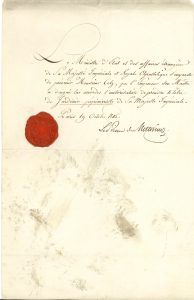 Clemens, prince de METTERNICH (1773-1859) diplomate et homme d’État autrichien. L.S., Paris 19 octobre 1815 ; demi-page in-fol., sceau de cire rouge (salissures)..« Le Ministre d’Etat et des affaires étrangères de Sa Majesté Impériale et...