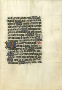 psautier. 2 fragments manuscrits avec 36 lettrines dorées et peintes ; 4 pages in-8 sur 2 ff. de vélin (19,5 x 14 cm) ; en latin..Feuillets calligraphiés et peints d’un psautier dédié à la Vierge Marie. Le premier donne un fragment du...