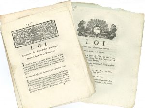 RÉVOLUTION. 28 imprimés, Paris 1790-1793 ; in-4, plusieurs ornés d’un bandeau..Lois concernant la contribution patriotique, le serment des prêtres, la fonte des cloches d’églises, les accusateurs publics, l’établissement des sourds-muets...