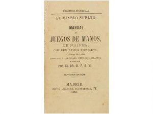 1868. (MAGIA). D.F.S.M.: EL DIABLO SUELTO. MANUAL DE JUEGOS DE MANOS, DE NAIPES, CUBILETES Y FISICA RECREATIVA, ... Madrid: 1868. 12°. 265 p. Enc. en plena piel. Doble tejuelo.