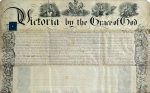 Deux parchemins liés par un grand sceau de cire jaune orné sur ses deux faces: l'une représentant la reine Victoria trônant entourée de deux allégories, et l'autre la représentant paradant à cheval avec le sceptre.