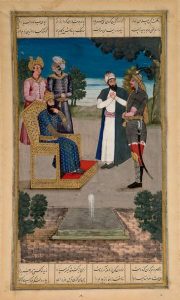 Illustrée sur une face d'une miniature à la gouache insérée dans le texte représentant un souverain couronné en trône, entouré de deux suivants et accordant une audience à un soldat. La scène se déroule dans un jardin agrémenté d'une fontaine au premier plan.