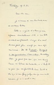 «[...] je m'excuse de vous bombarder ainsi de nombreuses lettres [...] Il s'agit d'un recueil de vases peints plus récents que ceux déjà mentionnés [...] Je pense que ceci, que vous devriez trouver au Cabinet des Médailles, ou à la B. N. ne peut que vous faciliter les choses. Inutile de dire que si vous trouvez quelque chose qui semble vous convenir, je m'en remets à vous [...]».