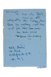 Billet autographe signé de Blaise Cendrars adressé au poète roumain