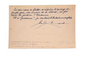Manuscrit autographe signé à l'encre de Paul Éluard de sa déclaration à la presse avant son départ de Grèce, paru dans les Lettres Françaises.