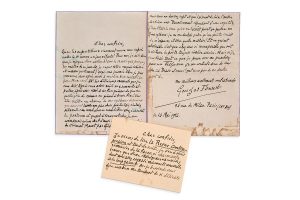 Carte autographe et lettre autographe signée adressées à «un cher confrère» 1920-1924. 2 pages in-16 et 2 pages in-8 à l'encre sur papier bleu (taches).