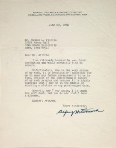 Hitchcock est face à un dilemme: il est très honoré de l'invitation qu'il reçoit mais ne peut l'accepter. En raison de son travail, il lui est impossible de programmer un déplacement car il y a de fortes chances qu'il se trouve au beau milieu d'un tournage. Finalement