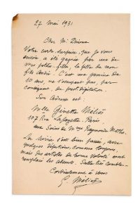 Lettre autographe signée adressée à M. DRIOUX S.l., 27 mai 1931. 1 page in-8 à l'encre sur papier (tache).