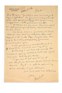 Lettre autographe signée adressée à Oliver BURGESS MEREDITH Stockholm, 25 juillet [1947], 1 page in-4 à l'encre bleue sur papier à entête de l'Hotel Plaza à Stockholm, en anglais.