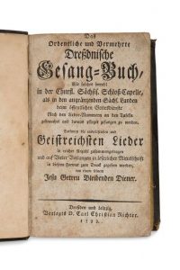 Das Ordentliche und vermehrte Dreßdnische Gesang-Buch, Wie solches sowohl in der Churfl. Sächs. Schloß - Kapelle, als in den angränzenden Sächsis. Landen beim öffentlichen Gottesdienste nach den Lieder - Nummern an den Tafeln gebrauchet und daraus pfleget gesungen zu werden. Darinnen die auserlesensten und Geistreichsten Lieder in reicher Anzahl zusammengetragen und auf Vieler Verlangen in leserlicher Mittelschrift in diesem Format zum Druck gegeben worden von einem seinem Jesu getreu bleibenden Diener. Dresden/Leipzig, Carl Christian Richter, 1793