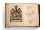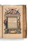 (collation: 1 ff. bl., A1-[D4], 1-118; aj-[ajjjj], I-XL, ff. d'impression). Titre-frontispice allégorique gravé à la main, avec gravure en pleine page des armes du royaume d'Espagne au verso, mémorial à Ortelius, portrait gravé d'Ortelius, et frontispice architecturé (Parergon), 151 cartes gravées rehaussées de couleurs, dont 38 dans le Parergon. Le tout monté sur onglets et magnifiquement rehaussé à la main de couleurs vives et d'or, lettrines gravées sur bois coloriées.