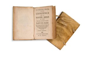 Diverses pièces pour la défence de la Royne mère du Roy très-chrestien Louys XIII. Faites & reveuës par Mre Mathieu de Morgues, Sieur de S. Germain, Conseiller & predicateur ordinaire du Roy Tres-chrestien & Conseiller predicateur & premier Aumonier de la Reyne-Mere de sa Majesté. Jouxte la copie imprimée à Anvers, 1637 2 volumes in-8, [8 ff. n. ch. (titre, dédicace au Roi, au lecteur, table des pièces)] - 496 pp. et 422 pp. - 8 pp. Plein vélin souple, dos long titré avec tomaison à l'encre, 2 lacets partiellement conservées (reliure d'époque).