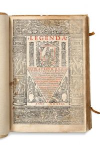 XIVe siècles, traité hagiographique sur la vie des saints et martyrs de l'Église médiévale. Édition illustrée de nombreux bois gravés représentant les différents saints. Beau titre-frontispice gravé.
