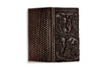 Plat supérieur orné d'un décor de cuir repoussé sculpté, illustrant en relief deux scènes du Nouveau Testament dans des quadrilobes: au registre du haut, la Crucifixion et au registre du bas, l'Adoration des Mages.