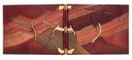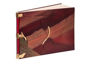 In-8 oblong, plats en polycarbonate, mosaïqué de pièces en polycarbonates en relief, le tout peint à l'aérographe dans les tons brun et vert, avec des incrustations de pièces de cuivre jaune, dorées, montées sur charnière, dos de maroquin bordeaux et noir, couverture, chemise et étui de même matière (Reliure